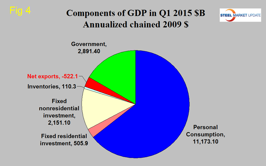 Comparing Q1 with Q4 2014 there were major changes in the sub-components. Personal consumption that had contributed 2.98 percent in Q4 2014 fell to 1.31 in the latest data. Personal consumption includes goods and services, the goods portion of which includes both durable and non-durables. Net exports were the major negative, contributed – 1.25 percent to the total and have been gradually worsening as the dollar has strengthened. Government expenditures also yielded a negative growth of – 0.15 percent. The contribution of fixed residential investment declined to almost zero but the contribution of nonresidential construction declined from 0.6 percent in Q4 to negative 0.44 in Q1. In the first quarter personal consumption accounted for 68.53 percent of total economic activity. Inventories which had contributed negative 0.1 percent in Q4 contributed 0.74 in Q1. Increasing inventories make a positive contribution to GDP and over the long run inventory changes are a wash and simply move growth from one period to another. Figure 4 shows the breakdown of the $16 trillion economy.