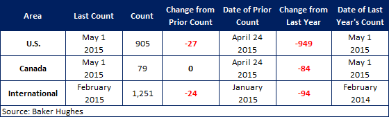 According to Baker Hughes data from May 1st, 2015, the U.S rig count for the week was 905 rigs exploring for or developing oil or natural gas. The last time the active U.S. count was this low was back on June 19, 2009 at 899 rigs.