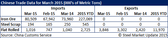 Chinese Iron Ore, Scrap & Flat Rolled Imports/Exports for March 2015