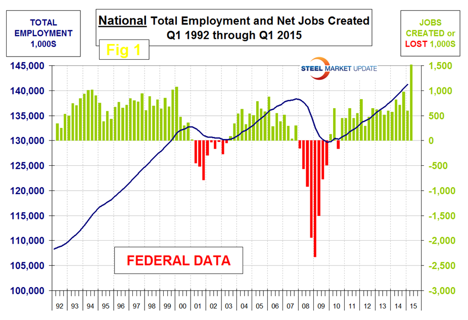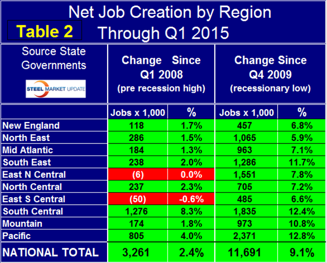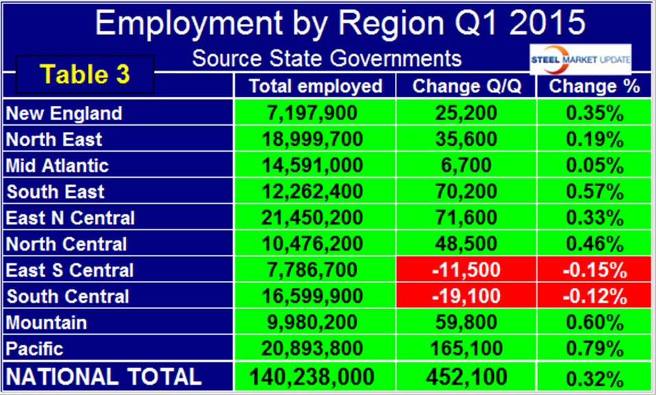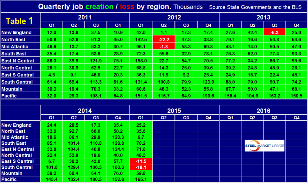 There were some dramatic changes in regional job creation in Q1 2015 which we conclude were highly influenced by the decline in the price of crude and the continuing decline in the price of natural gas. The South central region, (Texas, Louisiana, Arkansas and Oklahoma) which had the highest rate of job creation of all regions in Q4 2014, crashed in Q1 2015 and had a net loss of jobs. Table 1 shows the history of quarterly job creation by region for the last four years.