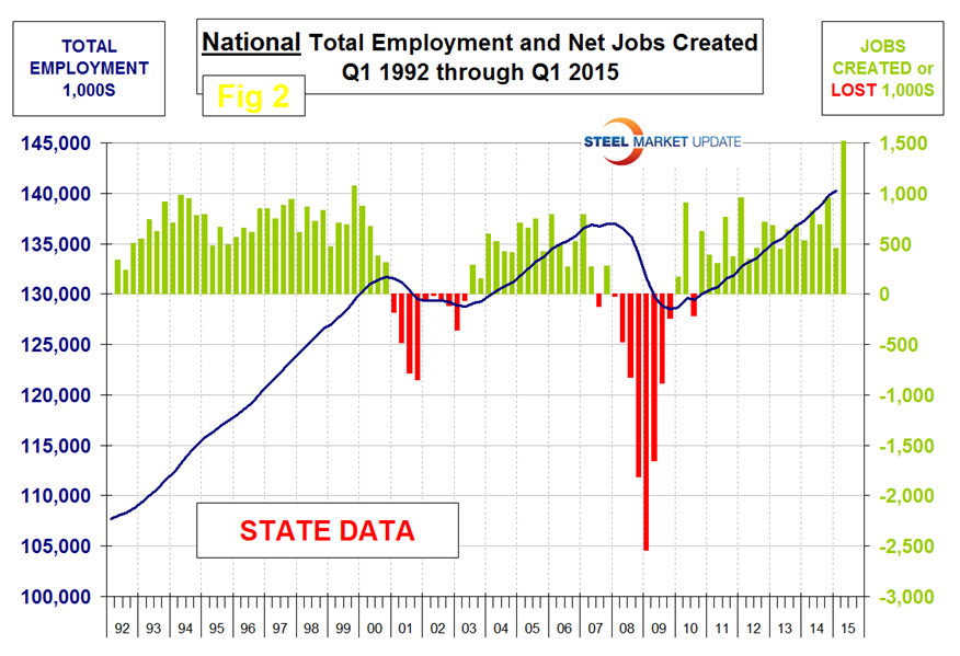 The states compile their employment numbers independently of the Feds then both are reported by the Bureau of Labor Statistics. The results are very close. In the last nine quarters since Q1 2013, the Feds reported total job creation of 5,992,000 and the states reported 5,895,000. Figure 1 and Figure 2 show the history of Federal and State totals since 1992. SMU has graphs in the same format for 10 geographic regions and can produce for individual states if a reader so requests.