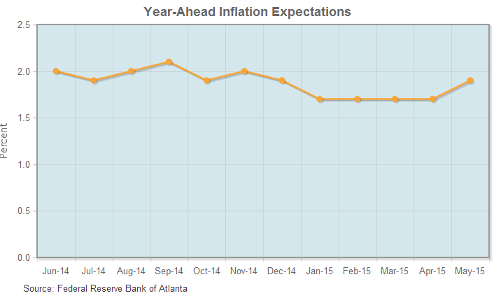 After remaining at 1.7 percent since January, Atlanta area firms surveyed in May are now expecting inflation to rise at a 1.9 percent rate in the coming year. Compared to this time last year unit costs are up 1.6 percent. The Business Inflation Survey conducted by the Federal Reserve Bank of Atlanta is monthly survey that measures year-ahead inflationary expectations, pricing pressures and general business conditions.