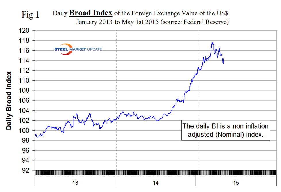 In 2014, the total U.S. trade volume was 25 percent of GDP therefore currency swings can have a huge effects on the rest of the economy and of the steel industry in particular. An explanation of the source data is given at the end of this piece. Our last publication of currency data was April 17th and since then the wave of green in Table 1 has backed off somewhat. On February 14th, only 3 of the 16 currencies listed were green in the one month column. On March 23rd this had risen to 4 and on April 17th to 15 meaning that the dollar had weakened against all but one of the steel trading currencies. In this latest analysis the number of greens has fallen to 10 in the one month column and fell again to 8 in the seven day column. Therefore we can see that the currencies of the steel trading nations followed the trend of the daily Broad Index in April but since then the dollar has strengthened slightly against half of the steel trading nation’s currencies.