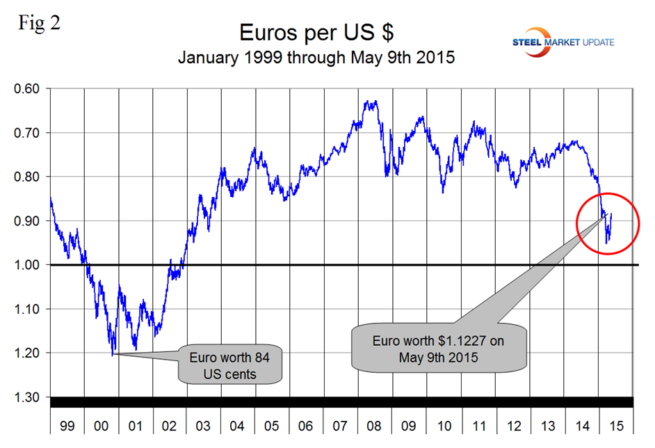 At SMU we continue to regard the saga of the Euro as having the most significant future impact on the US steel industry. On September 6th last year the Euro broke through the 1.3 US $/Euro level for the first time since July 11th 2013, on January 6th it broke through 1.20 and through 1.10 on March 7th. The Euro stayed below 1.10 until April 30th and has since strengthened to 1.1227 (Figure 2).