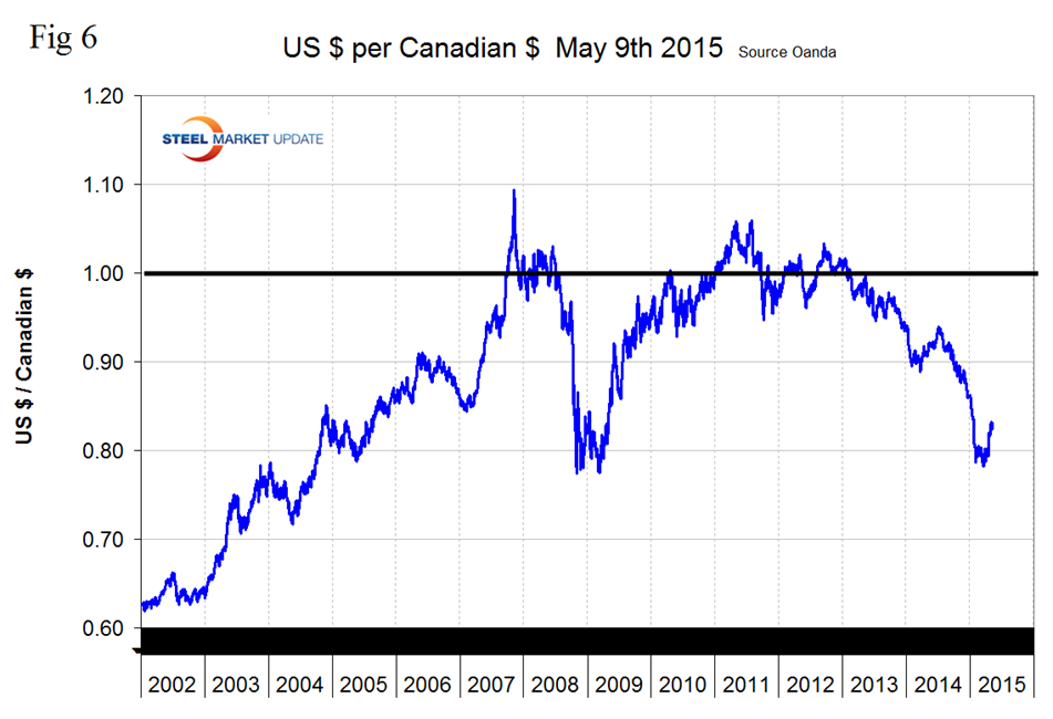 After trading in the mid to low 90 cent region for most of 2014 the Canadian dollar crashed through 80 cents on January 29th 2015, stabilized until April 16th and has since risen to 82.64 US cents on May 9th. The Loonie was down by 10.1 percent in the last year but up by 3.2 percent in the last month. Strengthening continued through the last 7 days (Figure 6).