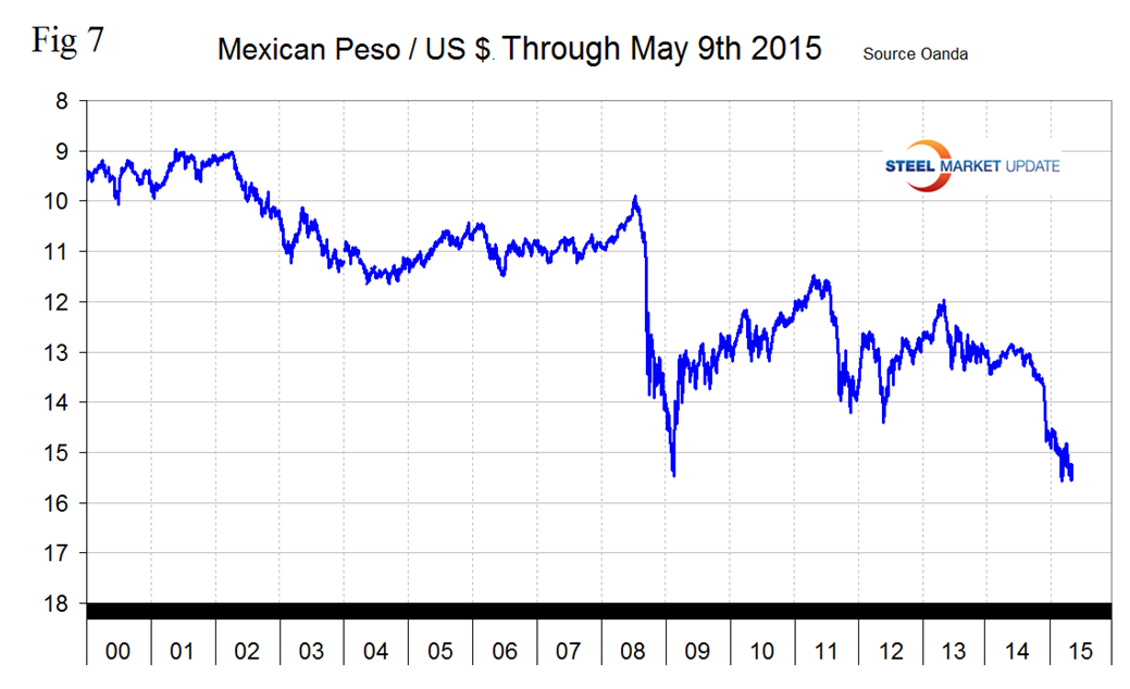 The Mexican Peso broke through 15 to the US Dollar on February 12th, bottomed out at 15.5786 on March 12th and has since been trading in a range as high as 14.82 ever since. On May 9th the peso was down by 15.0 percent in 12 months and 2.3 in one month but was up by 1.1 percent in 7 days (Figure 7). The Peso is weaker than at any time since early 2009 which has severe implications for the distribution of manufacturing within NAFTA.