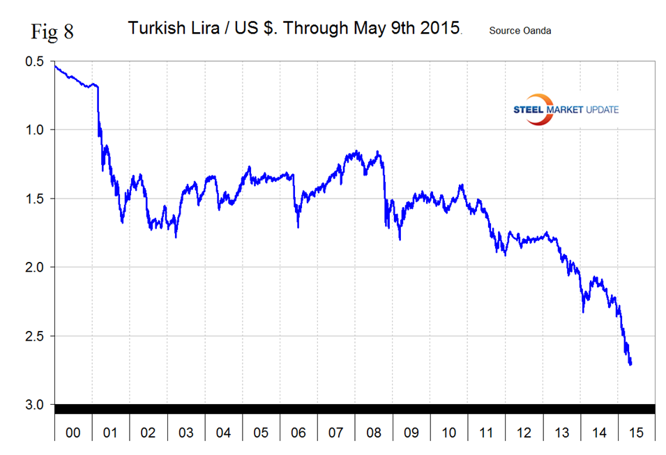 The Turkish Lira broke through 2.4 to the dollar on January 30th, through 2.5 on February 28th, through 2.6 on March 14th and closed at 2.6895 on May 9th. The Lira has declined by 21.1 percent in the last year and by 3.6 percent in the last month (Figure 8).