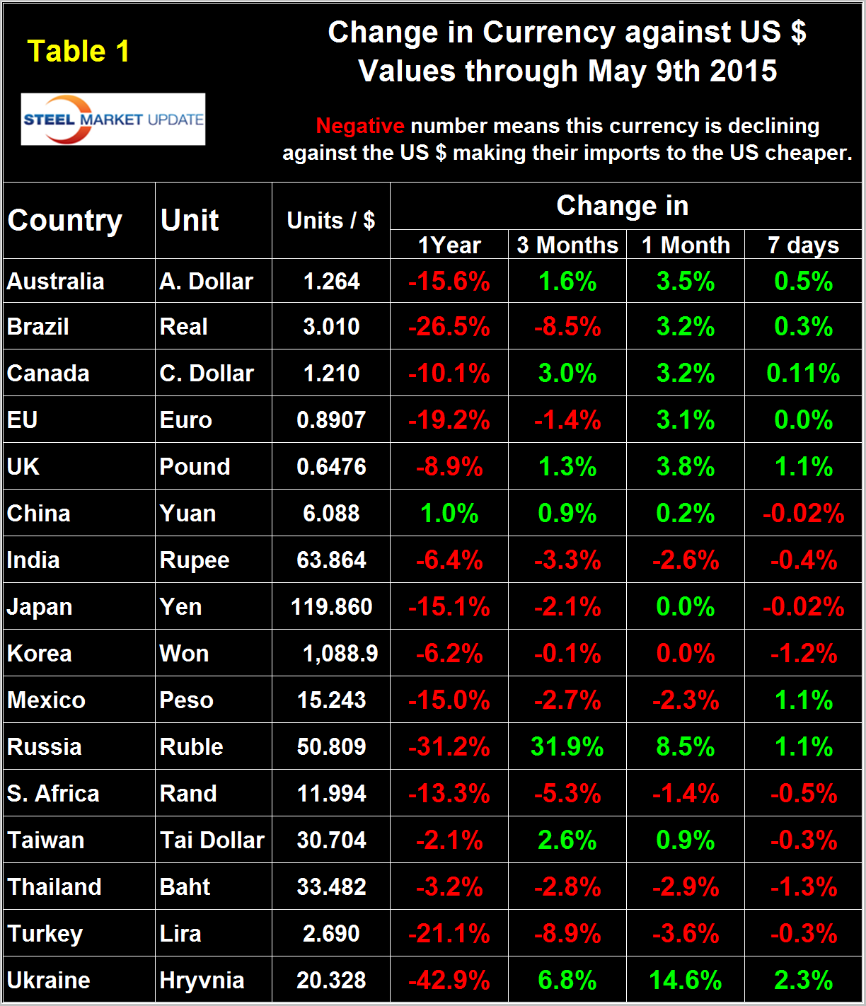 It does not necessarily follow that the currencies of the steel trading nations follow the Broad Index. Our data for the individual nations is 7 days more current than the daily BI which means that comparing the two is not quite apples and apples especially at times of volatility or direction reversal as we see today. Table 1 shows the number of currency units of steel trading nations that it takes to buy one US dollar and the change in one year, three months, one month and seven days. The table is color coded to indicate strengthening of the dollar in red and weakening in green. We regard strengthening of the US Dollar as negative and weakening as positive because the effect on net imports.