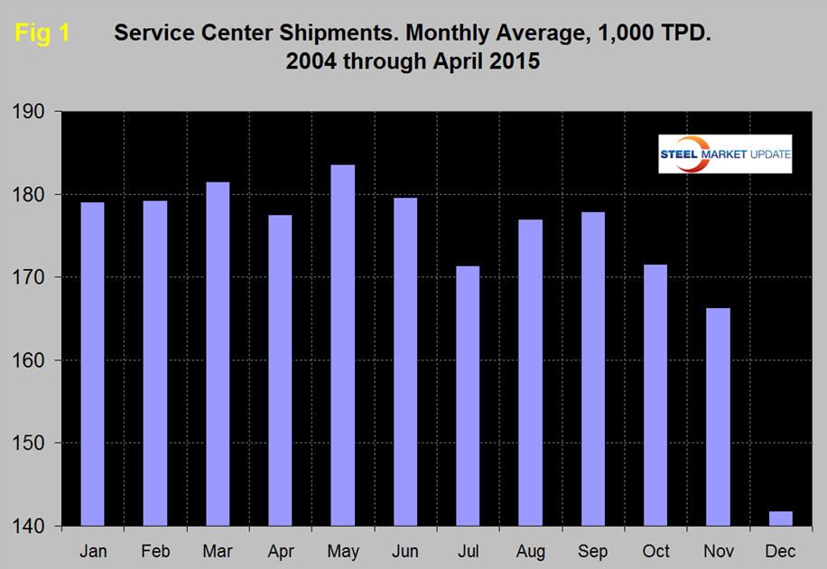 In the twelve years since 2004 April shipments on average have been down by 2.2 percent from March, this year shipments were down by 5.8 percent. So far in 2015 the change in performance for each month has been worse than the 12 year average. Figure 1 demonstrates the seasonality of service center shipments and why comparing a month’s performance with the previous month is usually misleading. For this reason in the SMU analysis we always consider year over year changes.