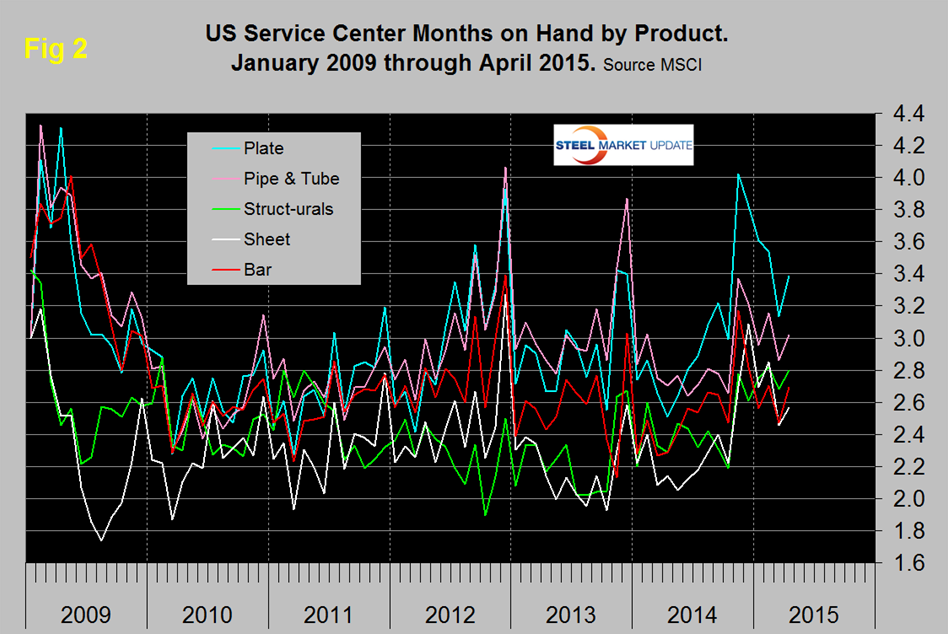 April closed with months on hand (MoH) at 2.79, up from 2.65 at the end of March and up from 2.24 at the end of April last year. All products had a year over year inventory increase led by plate which was up by 24.2 percent. Figure 2 shows the MoH by product monthly since January 2009. Plate products shot up to over 4 MoH at the end of November and were still high at 3.38 at the end of April.