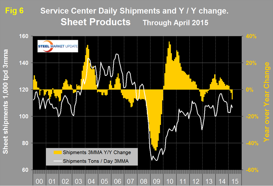 There continues to be a wide difference between the performances of flat rolled (sheet + plate) and long products (structurals + bar) at the service center level. Long products have had a very poor recovery from the recession. On a 3MMA basis y/y, the growth of shipments was negative for 21 straight months until April last year which was the first of eleven months of growth. However in March on a y/y basis shipment growth returned to negative territory at – 2.6 percent followed by April at -7.6 percent, (Figure 3).