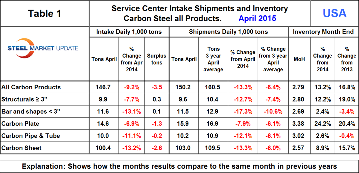 In April intake at 147,600 tons was 3,500 tons less than shipments. For all flat rolled and pipe and tube products except structurals and pipe and tube, intake was less than shipments and for long products intake was more than shipments. Shipments of all products on a t/d basis were down by 13.1 percent from April last year and were 6.4 percent less than the average April shipments for 2015, 2014 and 2013. The fact that the single month growth comparison is worse than the three year comparison is an indication that momentum is negative and growth is slowing. Shipments of all products were down year over year on a tons/day basis.