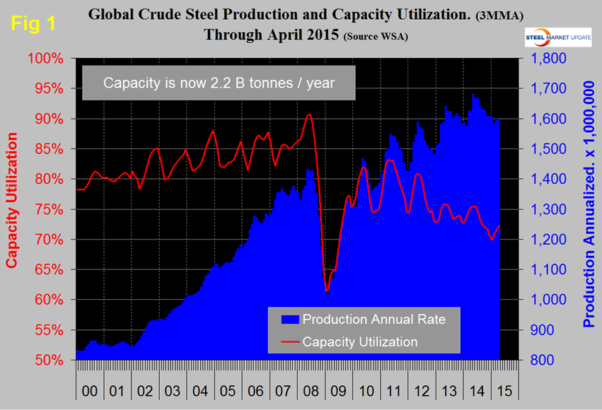 This is not happening in 2015 through April. As production has increased each year since the recession, capacity utilization has decreased, the gap is widening and has been estimated that surplus capacity is currently as much as 500 million tons per year, well over half of which is in China.