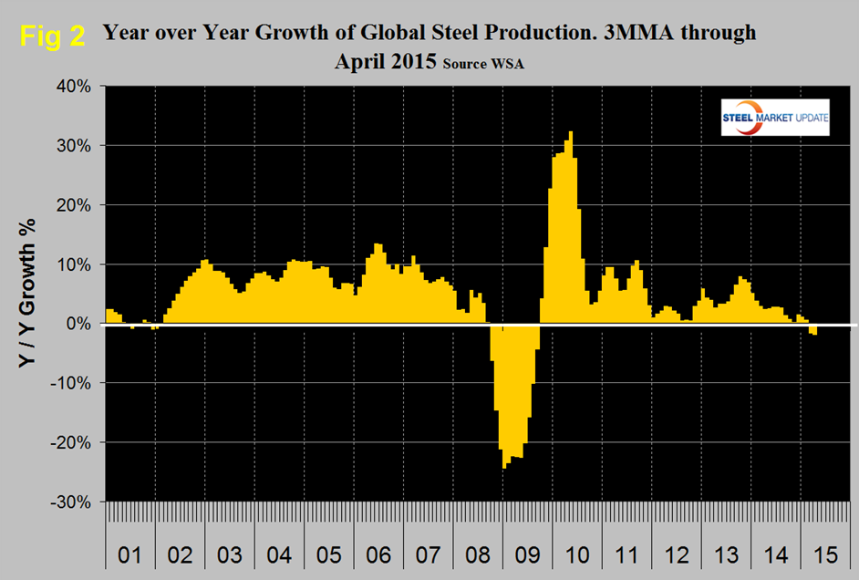 If the three month growth rate exceeds the twelve month we interpret this to be a sign of positive momentum and accelerating growth. The reverse is the case today for all regions except South America which has negative growth but a slight positive momentum. Comparing the three months through April in 2014 and 2015, the only nations in the top 10 to have positive growth were Russia and India with 4.5 percent and 6.2 percent respectively. China was down by 1.1 percent. North America was down by 9.4 percent in total with the US down by 11.1 percent, Canada down by 0.6 percent and Mexico down 6.3 percent. The European Union was down by 0.5 percent and other Europe led by Turkey was down by 4.3 percent. The effect of the war in Ukraine is clear in the contraction of that country’s steel production. Figure 2 shows the 3MMA of the monthly year over year growth of global steel production which was negative in March for the first time since September 2009.