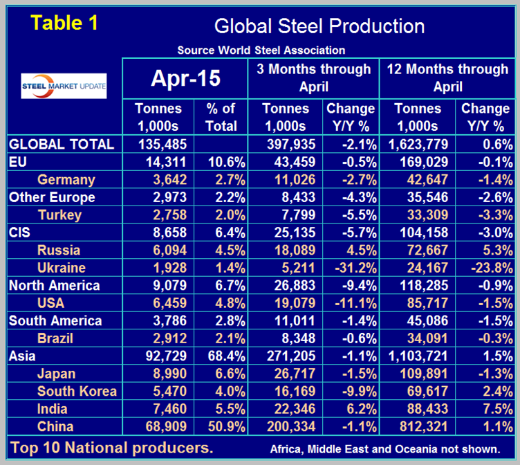 Global steel production in 12 months through April totaled 1.624 billion tonnes with a capacity of 2.2 billion tonnes which yields a utilization for the 12 month period of 73.8 percent. China accounted for 50.9 percent of global production in April. Asia as a whole, including India, accounted for 68.4 percent.