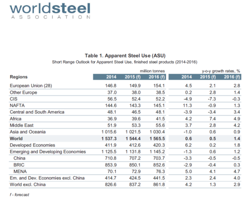 Last month we published the latest World Steel Association Short Range Outlook forecast for apparent steel consumption in 2015 and 2016. We are re-publishing it here for those readers who may have missed it and because as we stated last month the forecast for 2015 looks optimistic and that is increasingly the case (Table 2). Note that this is steel consumption, not crude steel production which is the main thrust of this piece.