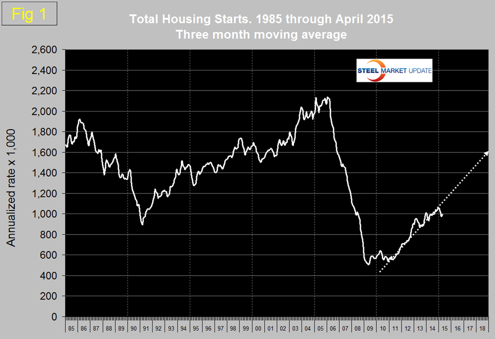 This projection is probably optimistic as the trajectory for the last two years does not get us to 1.6 million, more like 1.3 million. The 3MMA of March starts fell below a million after six consecutive months above that level and April did not break through that threshold. The year/year growth rate of the 3MMA of total starts in February was 7.4 percent, in March it was 4.4 percent and in April it was only 0.9 percent. On this basis we conclude that reports in today’s press are unrealistically optimistic. We hope we are wrong.
