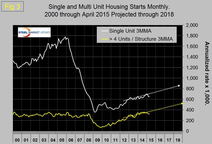 Multi-family starts are now beyond the pre-recession high of February 2006 but the growth of starts in this sector has slowed dramatically from a 3MMA year over year of 35.5 percent in August to 1.9 percent in March then to negative 4.1 percent in April (Figure 2).
