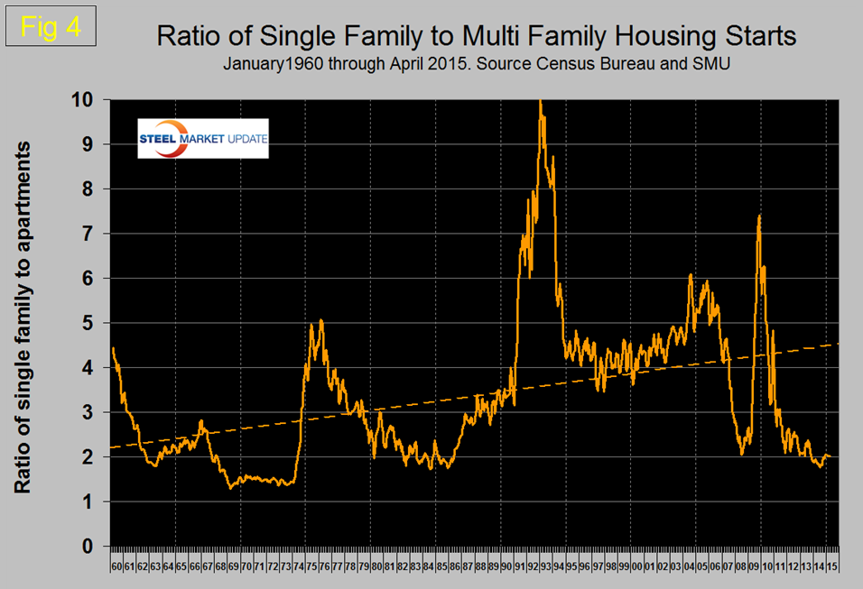 At the national level the differential between permits and starts for single and multi-family units is suggesting that the shift in consumer’s preference towards apartments is far from over. In April on a 3MMA basis permits of multi-family exceeded starts by 109,000 in contrast to the negative 9,000 for single family. In total permits were 100,000 more than starts. The differential between permits and starts for multi and single family units was the same across all regions with permits for multifamily far exceeding starts and permits for single family being less than starts. The implication is that apartment construction is poised to surge strongly and that single family construction will slow slightly. The ratio of the two sectors is shown in Figure 4 and demonstrates that single family compared to multifamily has improved slightly but single family homes continue to be less desirable than at any time in the last 30 years.