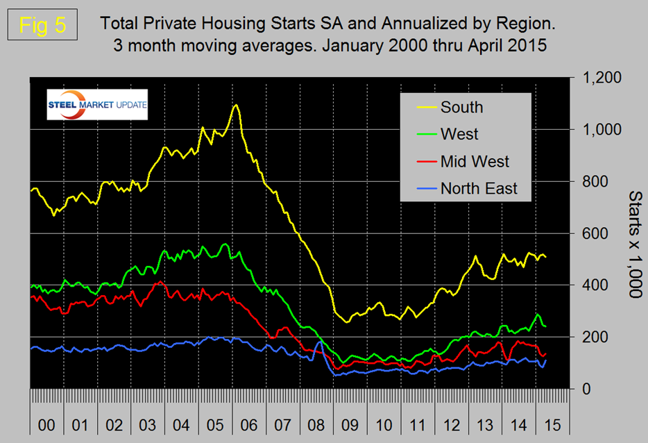 Figure 5 shows the regional situation for the 3MMA of total residential starts since February 2000. So far in 2015 only the South and North East have held their own.