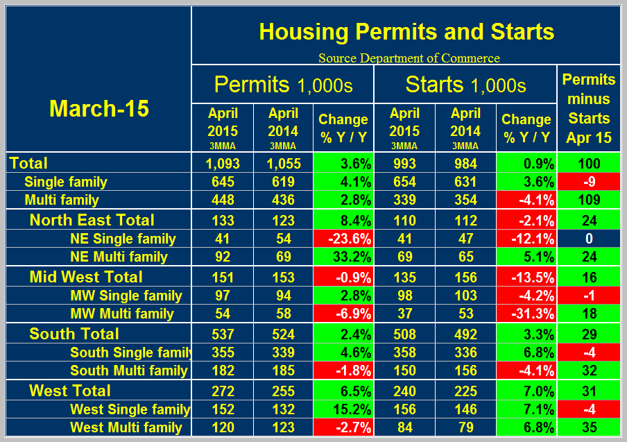 Permit data is useful is useful as a forward look at starts. If permits exceed starts then we anticipate an acceleration in construction starts and vice versa. Table 1 shows total permits and starts nationally and regionally.