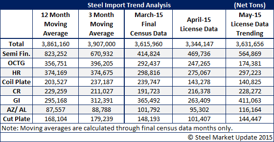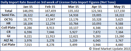 Steel Market Update (SMU) is picking up a small reduction in the daily steel import license data rate compared to prior months. As you can see from our table below, based on the third week of the month import license data as provided by the U.S. Department of Commerce, May is running at a 117,150 ton rate, down from 121,561 tons per day in April. What concerns us is the relative lack of movement lower on flat rolled products. Hot rolled, cold rolled and coated products (see below table).
