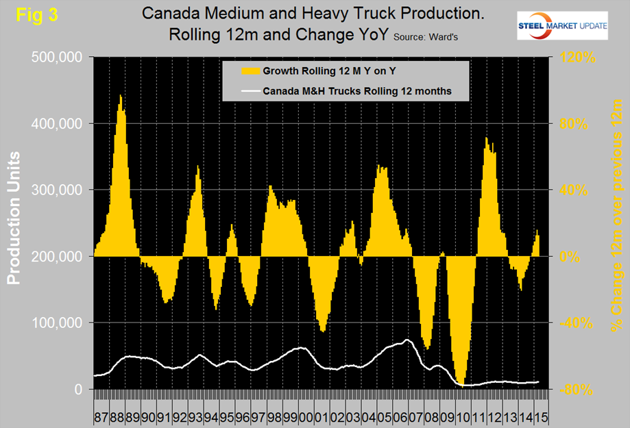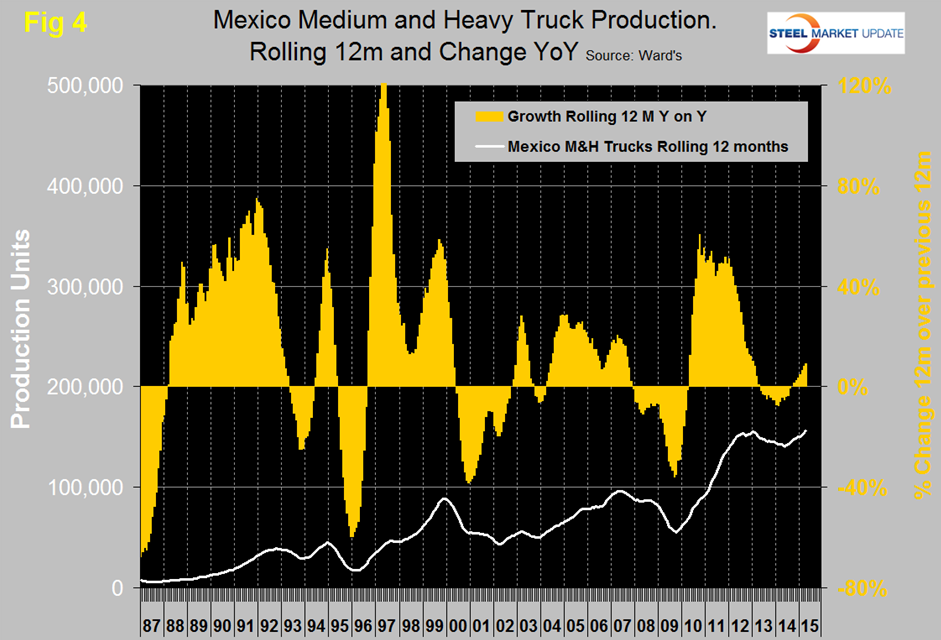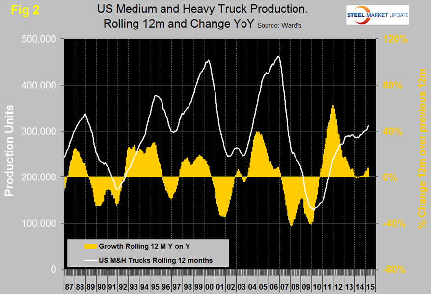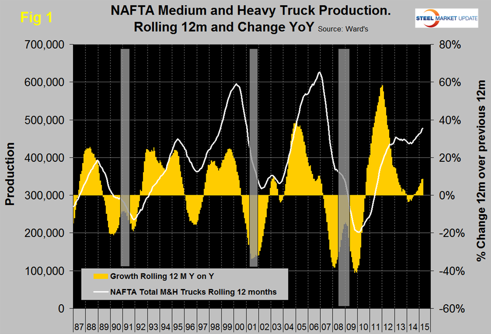 The lead time between the peak of production and the onset of recession was 22 months in 1990, 18 months in 2001 and 20 months in 2008. Readers may remember that in 1996 a recession was narrowly avoided and this also shows as a dip in M&HT production. We were concerned about the shape of the production curve in 2013 through H1 2014 but evidently this was just a hesitation. Truck production had negative year over year growth in the first half of 2014 but is now growing at an 8.6 percent rate with positive momentum.