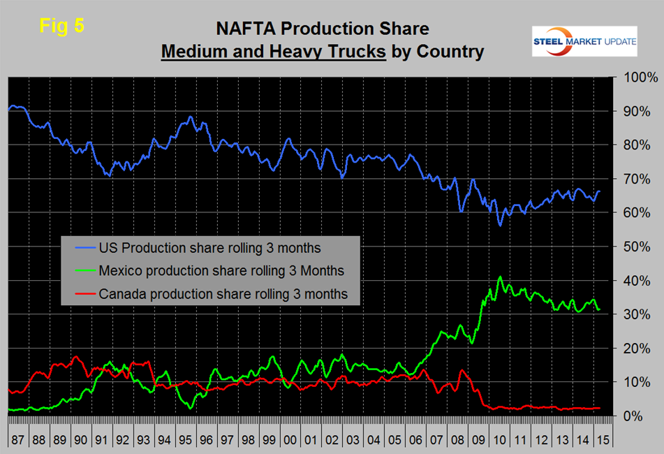 Note that to achieve true comparability the scales are the same. It can be seen that the growth rate in Canada has been relatively strong in the last few months but this is from a very low base and evidently the truck assemblers have made the decision to move their operations south. There has been a major shift in M&HT production share between the three NAFTA countries in the last four years. Figure 5 shows the production share of each country since 1987.