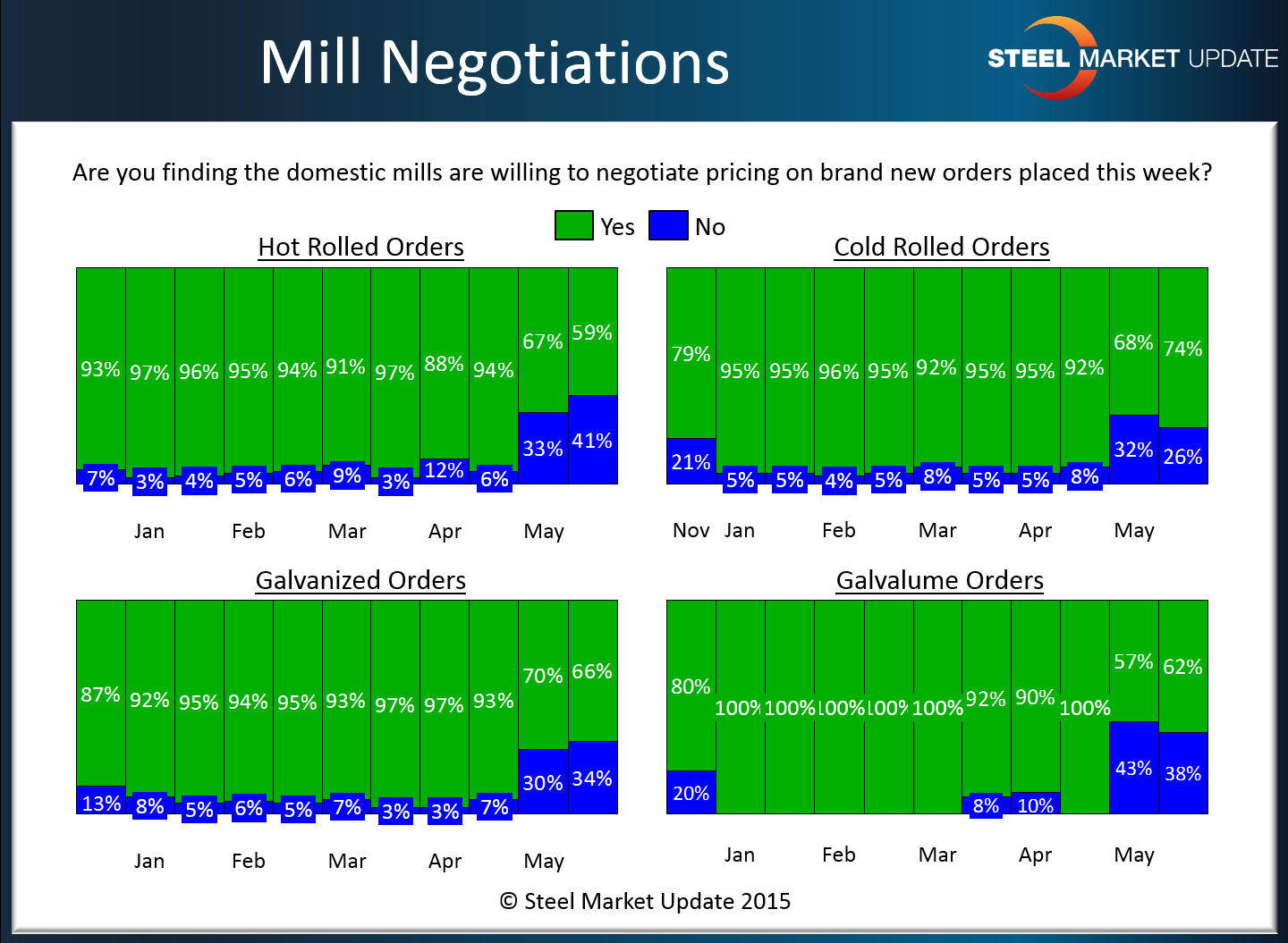 Steel Market Update (SMU) conducted our mid-May survey beginning on Monday of this week concluding our analysis earlier today. We found improvements (respondents reporting mills as less willing to negotiate pricing) on hot rolled and galvanized. The cold rolled and Galvalume results were slightly less optimistic as more respondents reported the mills as willing to negotiate than what we saw at the beginning of the month.