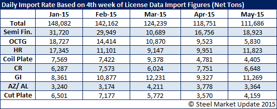 The table below compares the latest license data through May 26th to the same respective periods for the previous four months. This data is broken into tons per day for an easier comparison.