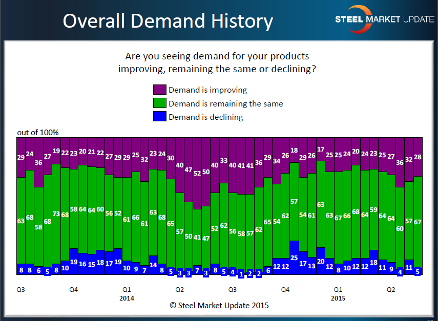 It is here that we also take our first look at steel demand. We ask all of the respondents if, in their opinion, demand for their products is: improving, remains the same or is in decline.