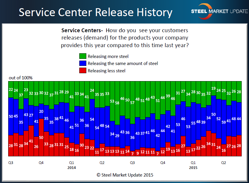 First, however, we want to return to our question about demand and how demand compares to this time last year. We asked the service centers/wholesalers how demand, as represented by their customer releases, compares to one year ago. We believe the graphic (below) says it all. Compare what we were collecting for responses on the same question during 2nd Quarter 2014 vs. 2015. Those reporting their customers as releasing less steel has doubled compared to one year ago and those who are reporting their customers as releasing more steel has been halved.