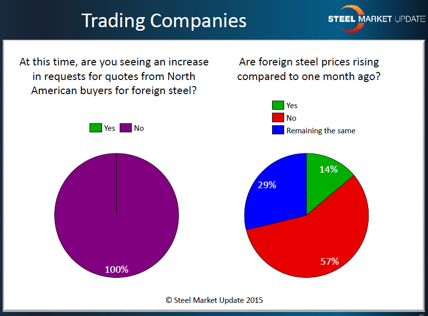 We generally don’t report on the data we have been collecting from other market segments since the number of respondents are more limited compared to our two major groups. Even so, we do gather information that gives us information about the industry. A good example is in the graphic below of a couple of the responses we got from our trading company respondents. Even with the recent price increase out of the domestic mills, the trading companies are reporting that their requests for quotes have not increased. Also, at the same time we got mixed results regarding foreign steel pricing. This is something that leads us to probe further to see what we can find out.