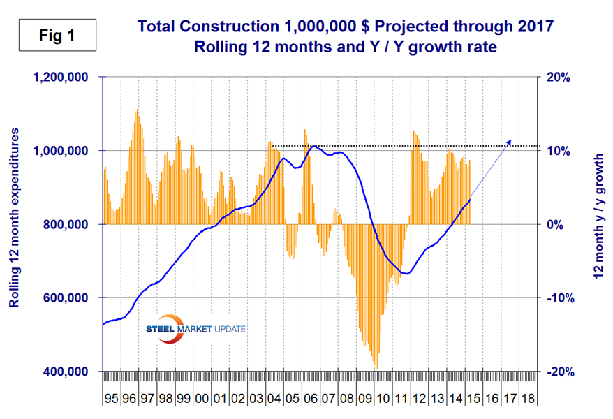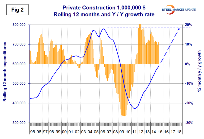The trajectory of total annual expenditures as shown by the blue line is still on track for a complete recovery in 2017. The pre-recession peak of total construction on a rolling 12 month basis was $1,145 B in 12 months through February 2007. The low point was $665.1 B in 12 months through October 2011. The 12 month total through the latest data of April 2015 was $866.746 B.