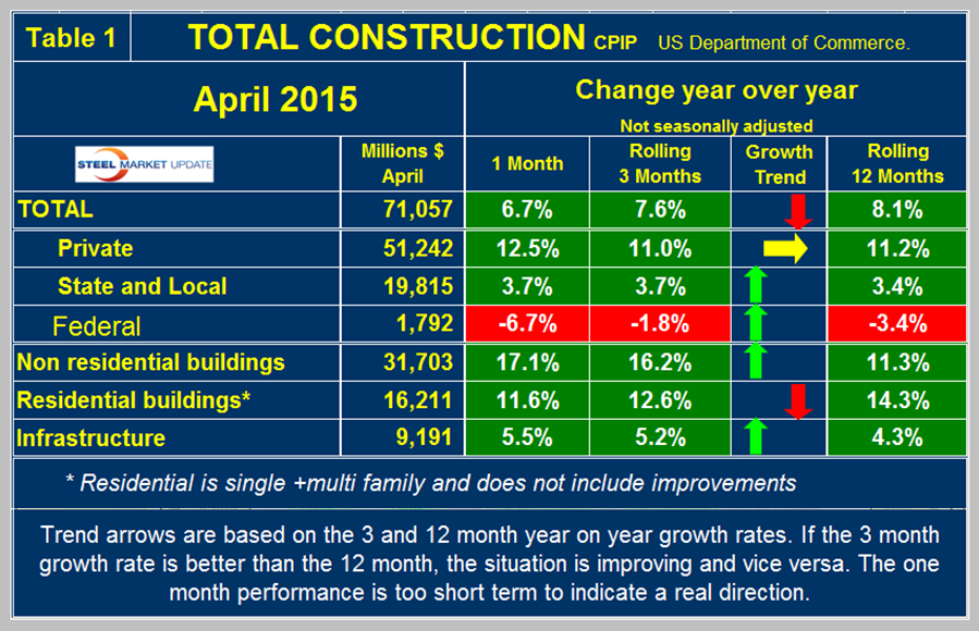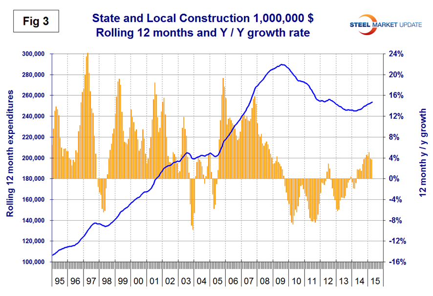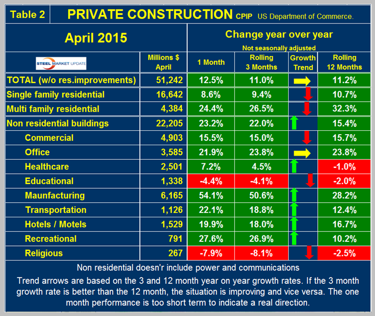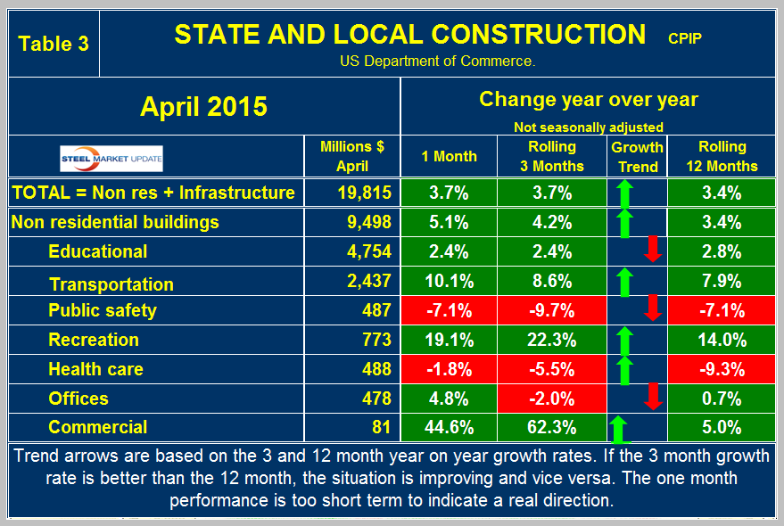 The blue lines in all four graphs in this report are 12 month totals which smooths out seasonal variation. Our analysis of residential construction in this report excludes improvements which are a huge expenditure but which we rationalize as a minimal consumer of steel. Excluding improvements our report shows that both single and multi-family residential continue to have strong y/y growth but both have negative momentum. The single family expenditures reported here have a rate of growth higher than that of single family starts reported by the Census Bureau which have starts growing at 3.6 percent. Starts being lower than current expenditures suggests a future slowdown. The discrepancy between this CPIP report and starts data for multi-family is huge. In this CPIP report multi family is growing at 26.5 percent as the multi-family housing starts data from the Census Bureau shows a collapse to 2.2 percent. Note: the housing data published around the 12th of each month reports starts in which the total project cost is entered in the single month of groundbreaking. The good news in the housing data from the Census Bureau is that permits improved in April. This suggests that the CPIP data for multi-family will decline strongly in the next few months then pick up again as newly permitted projects kick in. Private non-residential buildings grew at a 22.2 percent rate in three months through April y/y with a positive momentum. Within private non-residential, only education and religious buildings had negative y/y growth on a rolling three months basis. About 70 percent of educational buildings are financed by state and local government and this sector had a 2.4 percent growth rate. Private commercial buildings, offices, manufacturing, hotels/motels, transportation and recreational continued to have strong year over year growth in three months through April. In over 10 years since mid-2004, religious buildings have achieved positive growth in only six individual months and in that time period expenditures have declined from $8.6 B on a rolling 12 months basis to $3.47 B through April 2015.