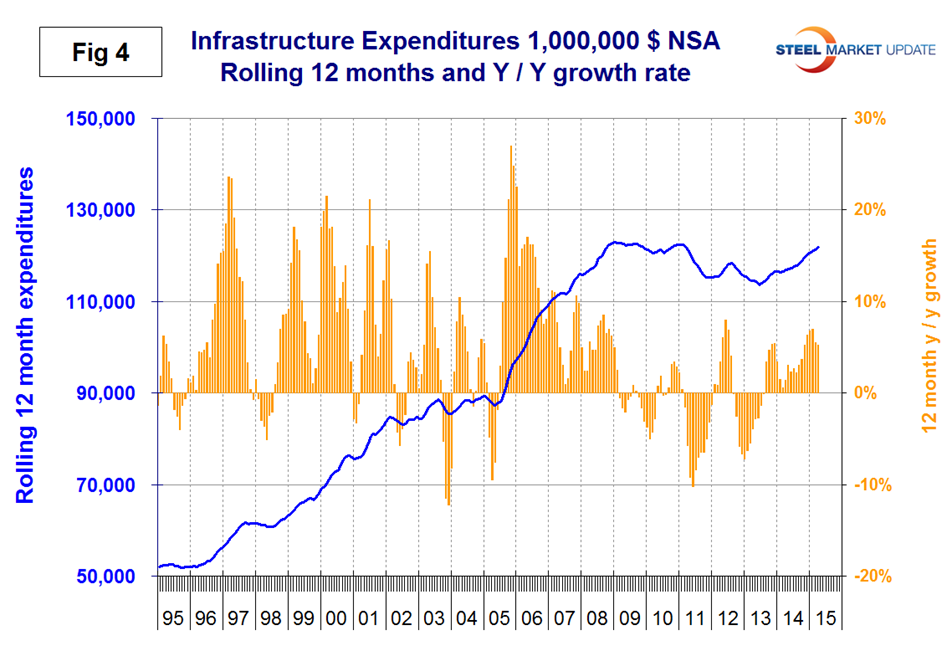 Highway pavement is the main sub-component of highways and streets and had a 1.7 percent negative growth in three months through April. This was only the 4th negative month since September 2013. Bridge work contracted every month in Q4 2014 but has since expanded every month this year (Not a seasonal effect as we are considering year/year data). Bridge work totaled almost 2.5 billion in the single month of April. Uncertainty about the future of federal aid is likely to last into early next year. That will mean restrained increases in infrastructure starts for both 2015 and 2016. After next year, hopefully, new legislation should combine with improved state finances and innovative approaches to funding surface transportation projects to help lift construction starts more vigorously. Water supply was up by 3.7 percent in three months through April and reports out of California suggest that construction in this sector will continue to accelerate. Conservation expenditures have been surging since November 2013 but the outlays are relatively small. On a rolling 12 month basis, infrastructure expenditures are about where they were four years ago, and have expanded for 20 straight months (Figure 4).
