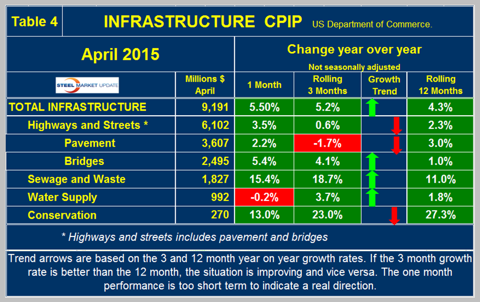 Infrastructure: Expenditures have had positive growth in each of the last 20 months through April with a +5.2 percent result in the latest data and positive momentum. Highway and streets including pavement and bridges accounts for about 2/3 of total infrastructure expenditures and had positive growth for 15 months through February, contracted slightly in March then recovered to a minimal growth rate of 0.6 percent in three months through April (Table 4).