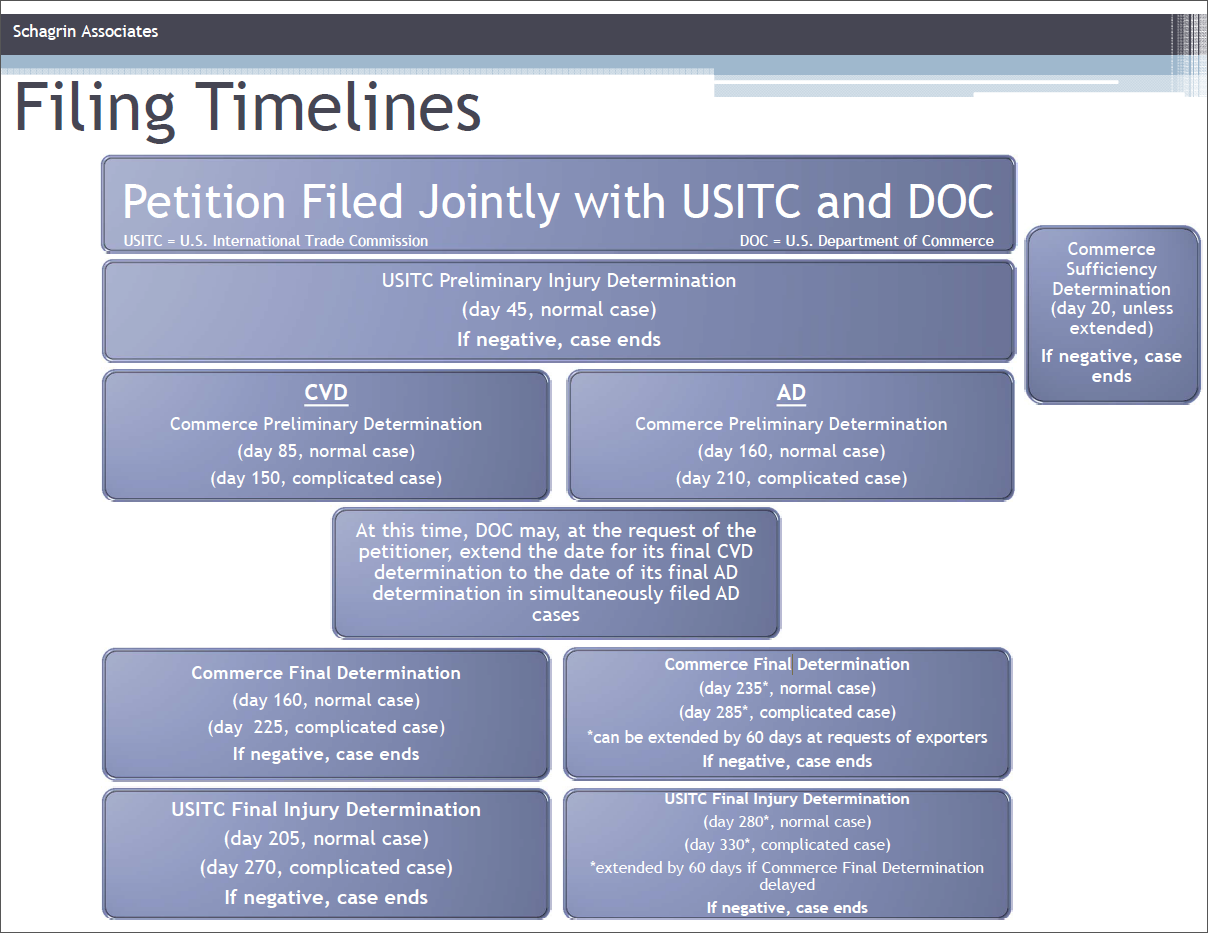 SMU checked with attorney Roger Schagrin who supplied us with an excellent chart on what happens when an AD (anti-dumping) or CVD (countervailing duty) case is filed with the US Department of Commerce and the International Trade Commission.