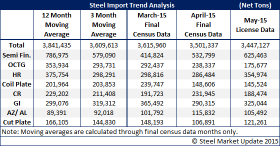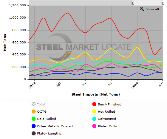 Semi-finished (blooms, billets, and slabs) imports recovered 118,000 tons from the four year low we saw in March, coming in at 532,799 tons. Semi-finished steels are purchased by the domestic mills and the vast majority of the slabs are going to mills such as California Steel, AM/NS Calvert, NLMK USA and others.