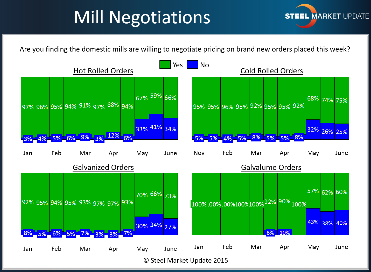 As you can see by the graphic below, 66 percent of the respondents reported hot rolled pricing as negotiable, 75 percent reported cold rolled pricing as negotiable, 73 percent galvanized and 60 percent Galvalume.
