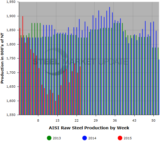 For the week ending June 6, 2015, the American Iron & Steel Institute (AISI) estimated the U.S. steel industry produced 1,722,000 net tons of raw steel, a 1.3 percent increase over the previous week but an 8.8 percent decrease over the same week one year ago. The estimated capacity utilization rate is 72.8 percent, up from 71.9 percent last week but down from 78.5 percent last year.