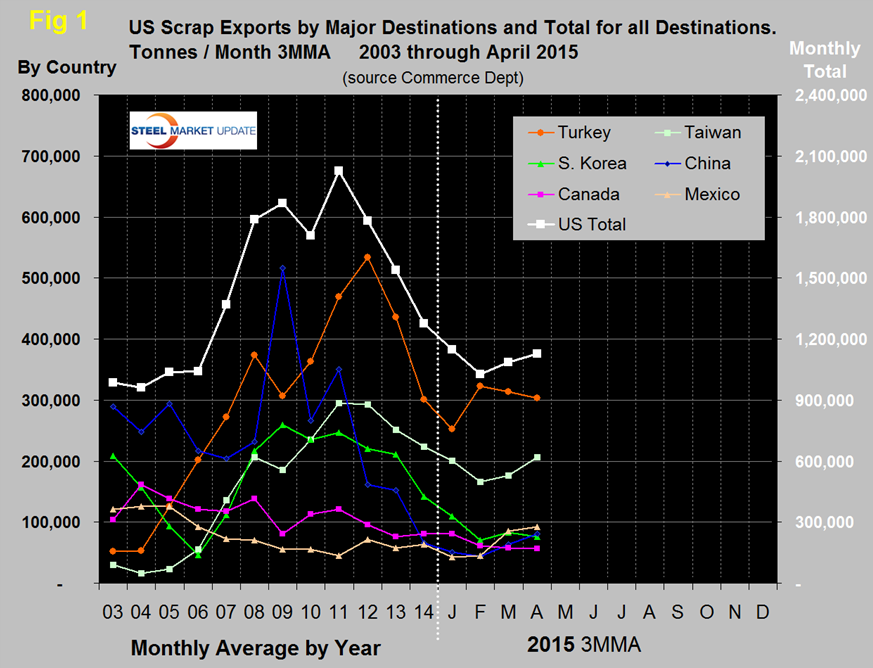 The graph shows that exports declined for three consecutive years, 2012 through 2014, and continued through January and February this year. March saw a trend reversal that continued in April. In the twelve months of 2014, scrap exports totaled 15,308,000 tonnes, down by 17.1percent from the same period in 2013. Early reports of May shipments are mixed with the AMM reporting on May 13th that East Coast bookings to Turkey had surged in response to a tightening of the European market. There had even been one 25,000 ton sale to Turkey from the West Coast. On May 28th AMM did an about face and reported that an absence of bulk scrap export sales was keeping prices on the East Coast stable. Activity was also scarce on the West Coast with no new bulk sales in the past week.