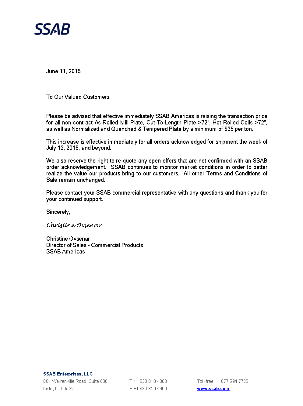 Please be advised that effective immediately SSAB Americas is raising the transaction price for all non-contract As-Rolled Mill Plate, Cut-To-Length Plate >72”, Hot Rolled Coils >72”, as well as Normalized and Quenched & Tempered Plate by a minimum of $25 per ton.