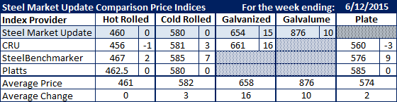 Cold rolled saw similar results with SMU and Platts unchanged from the prior week (and both at the same $580 number) while CRU was up $3 (to $581) and SteelBenchmarket was up $7 (to $585). The average of all 4 indexes is now $582 per ton.