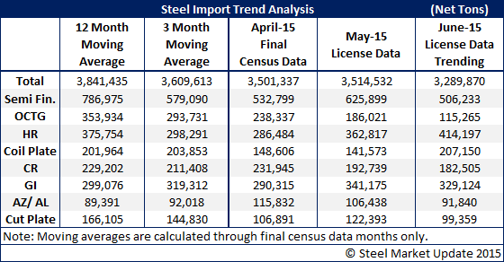 The trend, and our readers must understand that we are talking specifically about the trend now and not actual imports due to the volatility one can get from import license data alone, is for oil country tubular goods (OCTG) to be much lower than both their 3 month and 12 month moving averages (see table below). We are also seeing reductions in semi-finished (mostly slabs which go to the domestic steel mills for further rolling) which also could come in much lower than their 3 and 12 month moving averages.