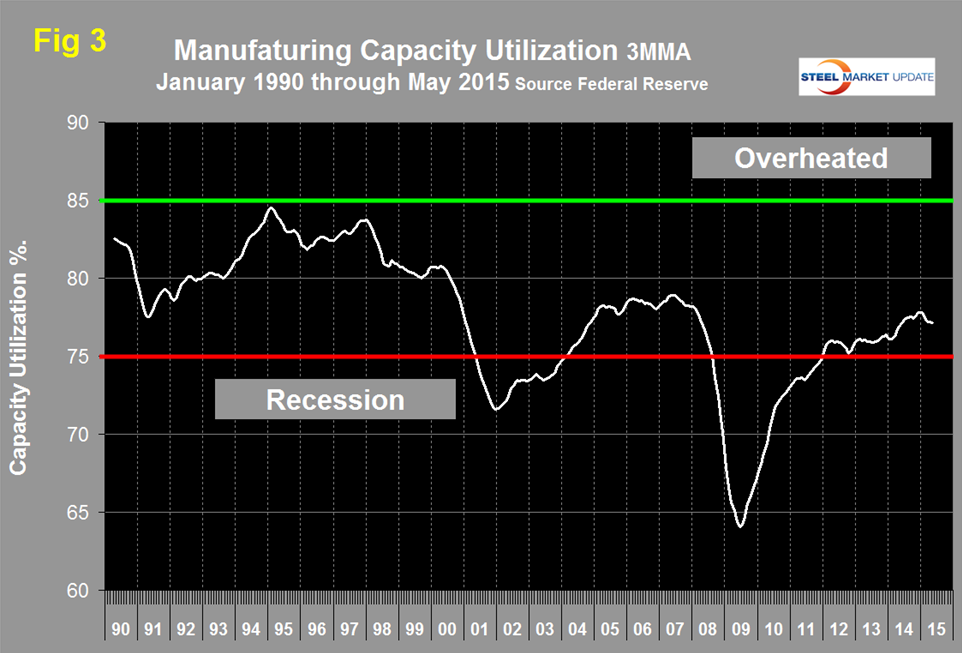 Manufacturing capacity utilization was 76.97 percent in May with a 3MMA of 77.14 which was a decline of 0.51 since last November, (Figure 3).