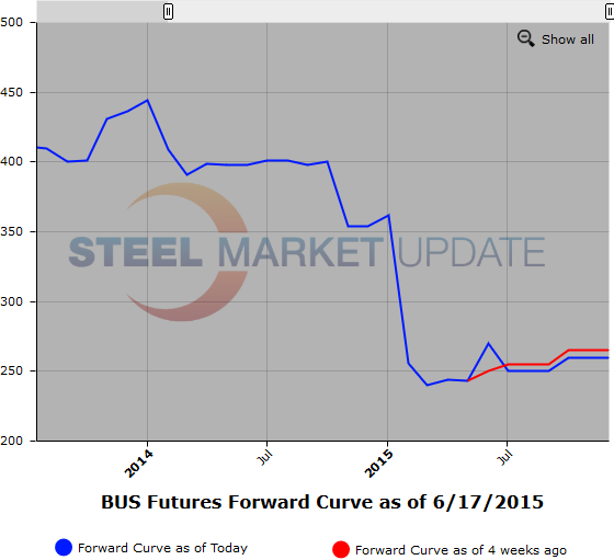 Below are two graphics of the HRC and BUS Futures Forward Curve. The interactive capabilities of the graphs can only be used in Steel Market Update website here. If you have any issues logging in or navigating the website please contact us at info@steelmarketupdate.com or (800) 432 3475.