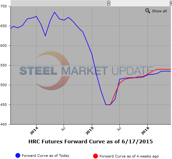 At the time of this writing, 2016 futures are trading at a roughly $70/ton premium over the current spot price, give or take a few dollars depending on your assessment of the spot market. Q4 of 2015 futures are lower, but the $60/ton contango out to that period also looks substantial. There are a few ways of looking at these spreads; historically speaking, the price is low and should be attractive to buyers who are looking to lock in buying at a price well below what they would have paid in the same period a year ago. Frankly, $520-$530/ton for HRC has looked like a bargain in any recent year and that will lead some buyers to be proactive about taking advantage of low pricing. On the other hand, some signs suggest that $60-70/ton of upside in the current HRC market seems optimistic.