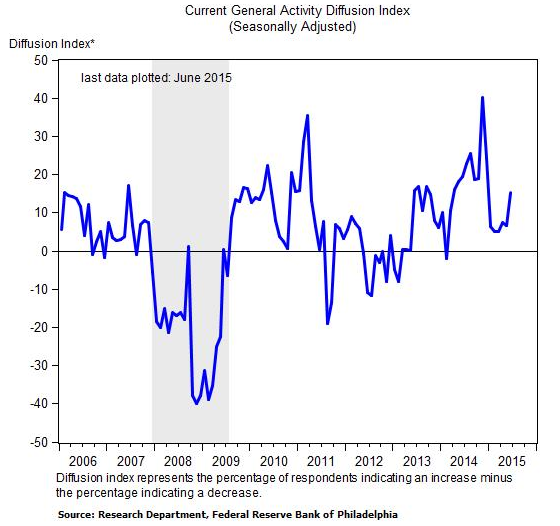 The survey’s indicators for general activity, new orders, and shipments all improved from their readings in May. The headline diffusion index for current activity increased to 15.2 in June from 6.7 in May.