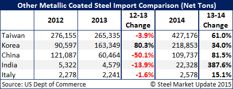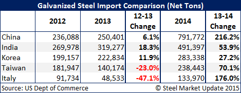 We first looked at galvanized and found China, India and Korea expanded their volumes exported to the United States in both 2012 and 2013. China tonnage, in particular, stuck out as the increase in 2014 was 216.2 percent higher than the prior year.